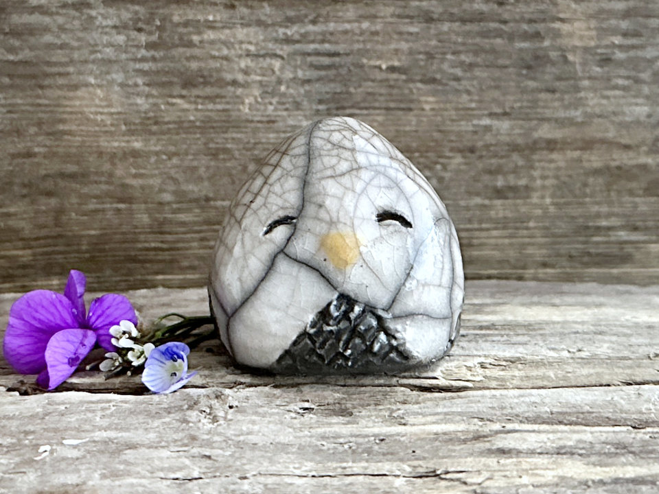 This owl statue is made from stoneware, glazed in non-toxic glaze, and raku fired for the amazing effects of fire and smoke.